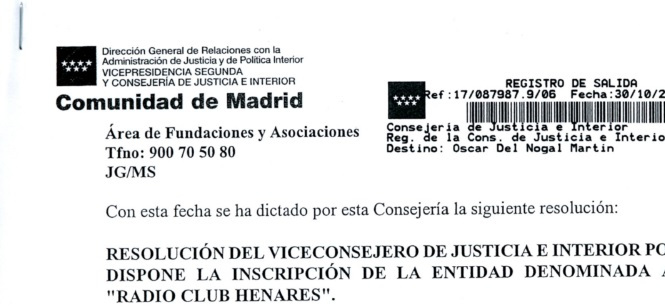 - Se registra el Radio Club en el Registro de Asociaciones de la Comunidad de Madrid con el número 28.249.